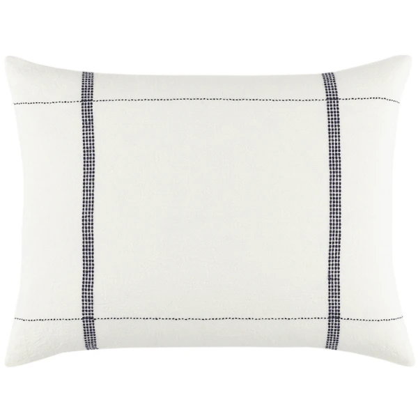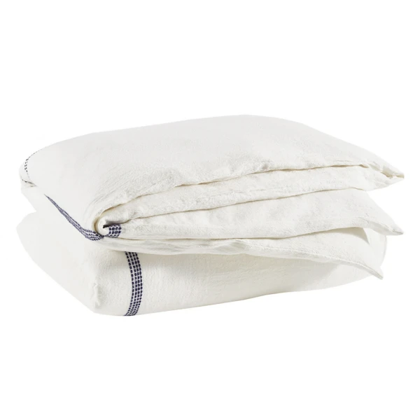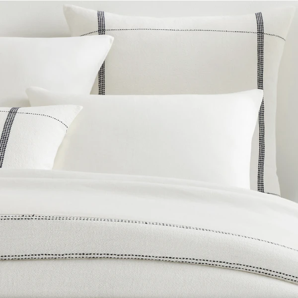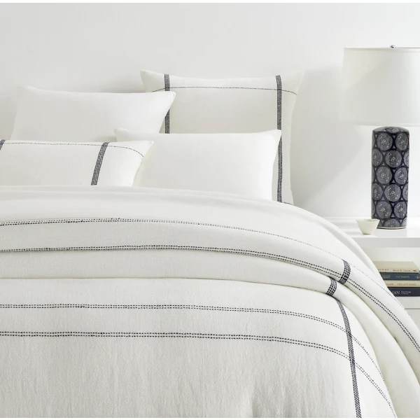 Pine Cone Hill's Atherton Navy boasts large windowpane checking that will add a modern farmhouse aesthetic to any decor. Subtly engineered to resemble hand stitching, the heirloom flaxen quality softens with every wash, with very little wrinkling, and is made to last a lifetime. It was inspired by antique homespun grain sacks. Knife edge finish. Shams have tie closures. Duvet has hidden button closure and knife edge finish. Inside corner ties to help keep duvet insert secure. Handmade 55% Linen/45% Cotton.