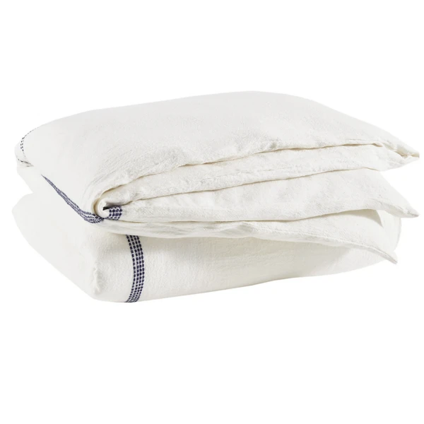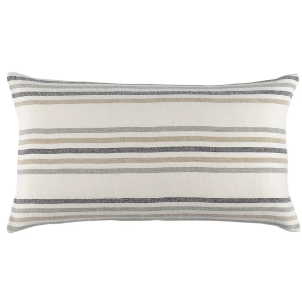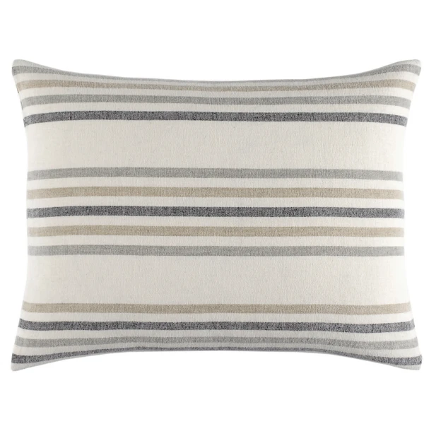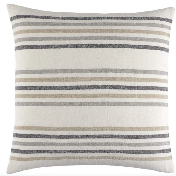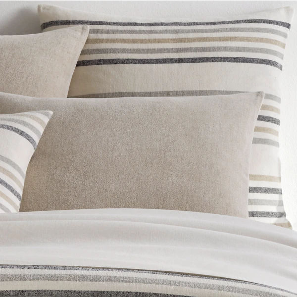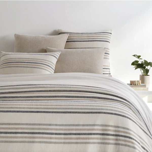 Pine Cone Hill's Ellison Stripe Linen Chenille is so soft to the touch and has a fantastic drape.  This luxurious linen chenille collection adds a modern graphic edge in Charcoal, Grey, and Natural stripes on Ivory. The subtle suede texture is woven from velvety chenille yarn in a fantastic blend of cotton for softness, linen for texture and strength, and viscose for a silky drape. Hidden button closure. Inside corner ties to help keep duvet insert secure.  Shams have closure ties.
