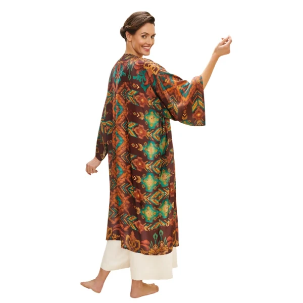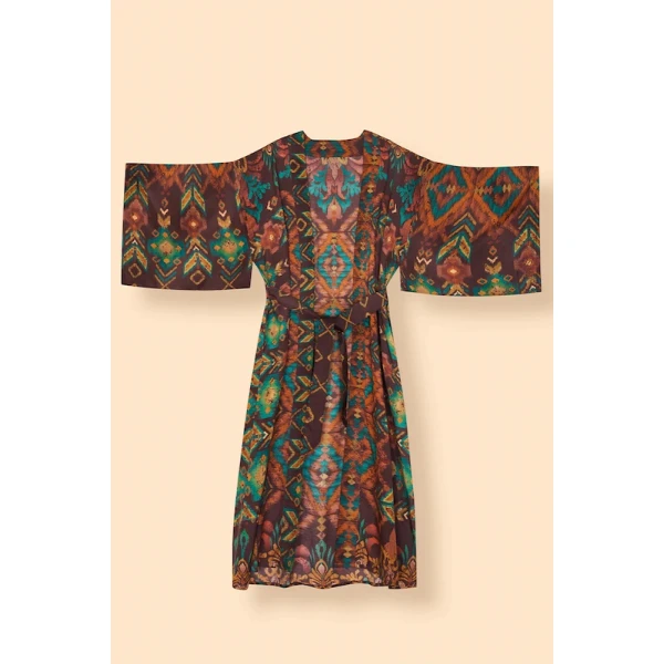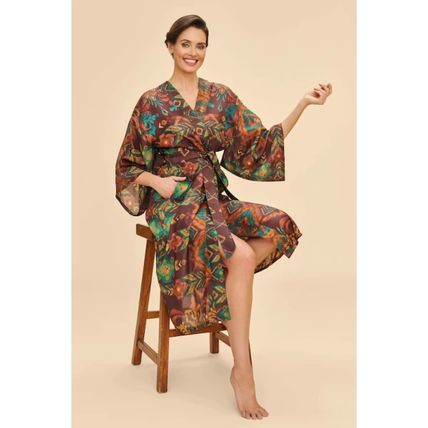 Introducing Powder's new ikat kimono jacket design in chocolate! Inspired by traditional dyeing methods and vintage colorways, this fabulously unique print adds an exotic look to any outfit. Wear with jeans and a top for the ideal coverup. Go on, treat yourself!