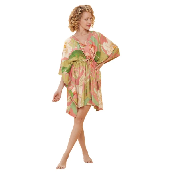 Powder Design's Delicate Tropical Beach Cover Up in Candy is a printed beach cover up that is equally perfect thrown over a bikini or styled for holiday promenading! With a drawstring waist you can wear this fitted or flowing. The delicate tropical print is bold but in an elegant way with a 1920s aesthetic.