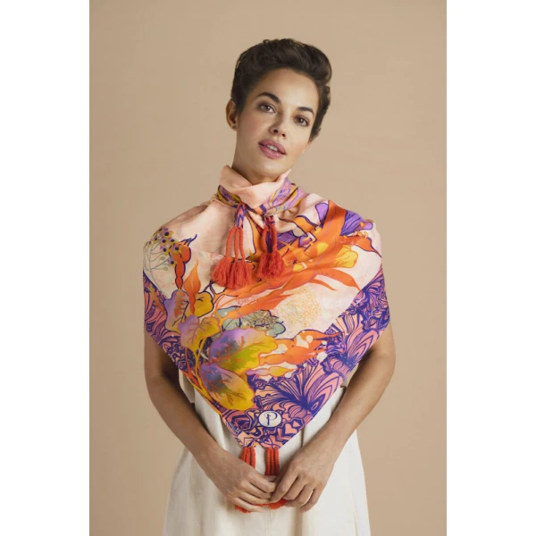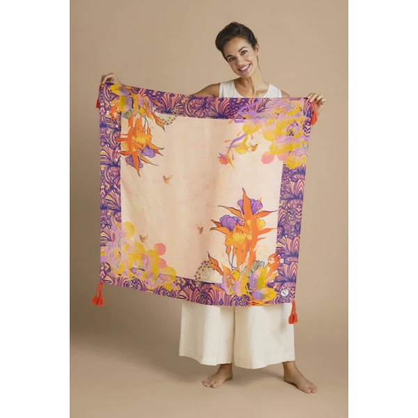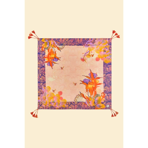 Powder Design's Tasseled Silk Tropical Hummingbird Scarf channels all things Powderful!   This scarf features elaborate florals and charming hummingbird motifs. The pink tones of this glorious silk scarf combine with vivid orange and purples for a look which is both elegant and striking. Combined with premium tassels, this can be worn so many ways - combine with linen dungarees or your favourite denim combo for effortlessly chic styling! Comes with a bespoke limited edition silk scarf complimentary gift box to make for a perfect gift or treating yourself!