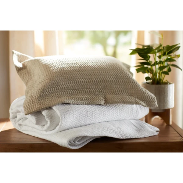SDH Hibiscus decorative pillows are classic washable jacquard that combines simplicity with sophistication. Available in covers and shams. 100% Egyptian Cotton. Yarn dyed jacquard. 802 Threads per square inch. Woven in Italy. Available only in white.