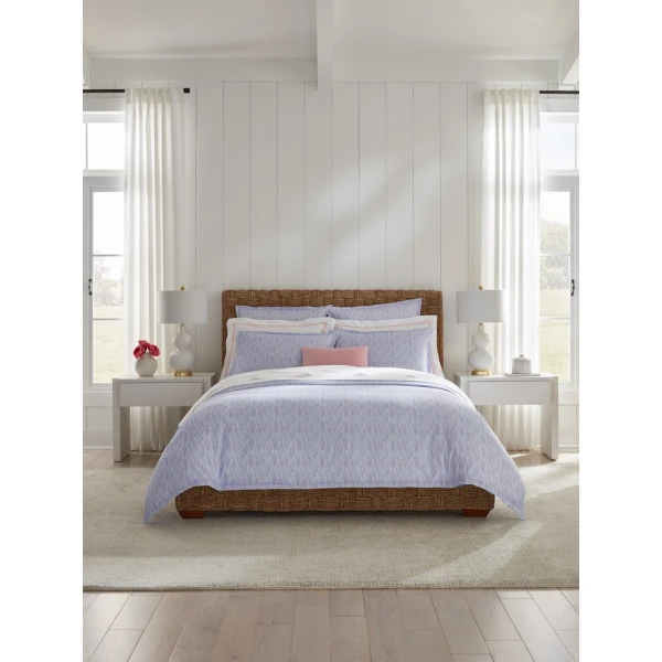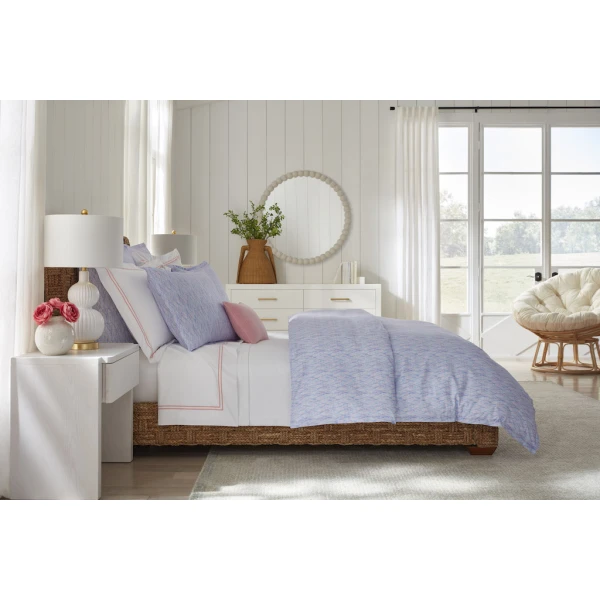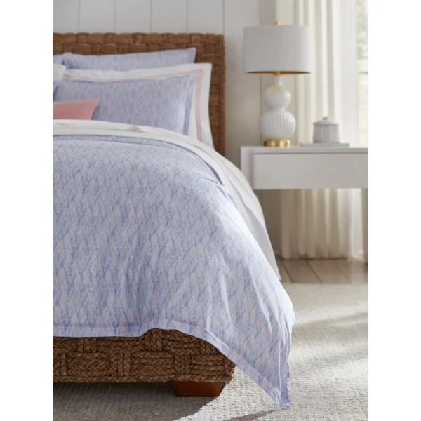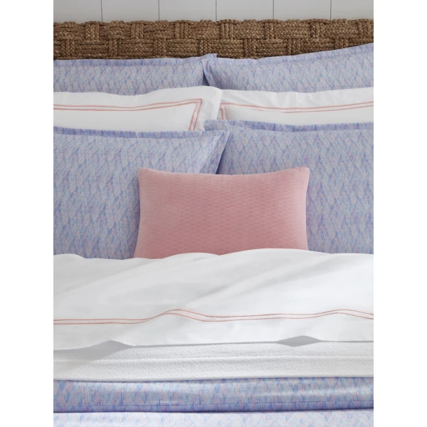 Sferra's Alessia is whimsical with a brushstroke herringbone pattern.  The design is elegant and artistic. It has a plain hem finish.  Duvet Cover and shams have 1" mini flanges.  Flat sheets and cases have 3" flanges.  Printed percale.  100% long-staple cotton.  Italy.
