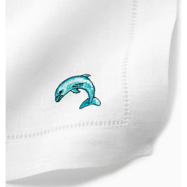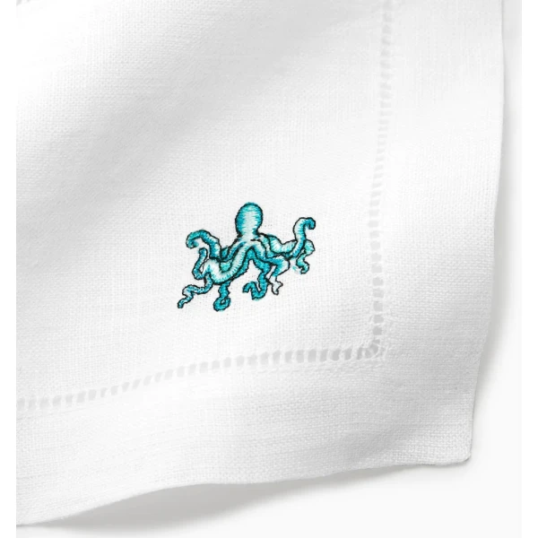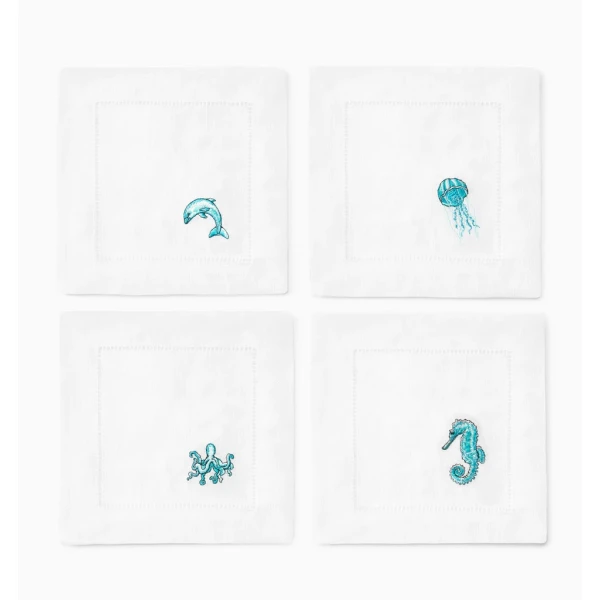Sferra's Amalfi Cocktail Napkins will add a cool touch to your party scene with charmingly embroidered cocktail napkins that feature beautiful marine life on a white Festival linen base.  Each collection includes 4 different motifs.  A set of 4 makes the perfect hostess gift.  Embroidered on Festival cocktail napkins.  Plain weave linen with machine embroidery.  1-inch hand drawn machine hemstitch.  Comes in an organdy gift bag.  100% linen.