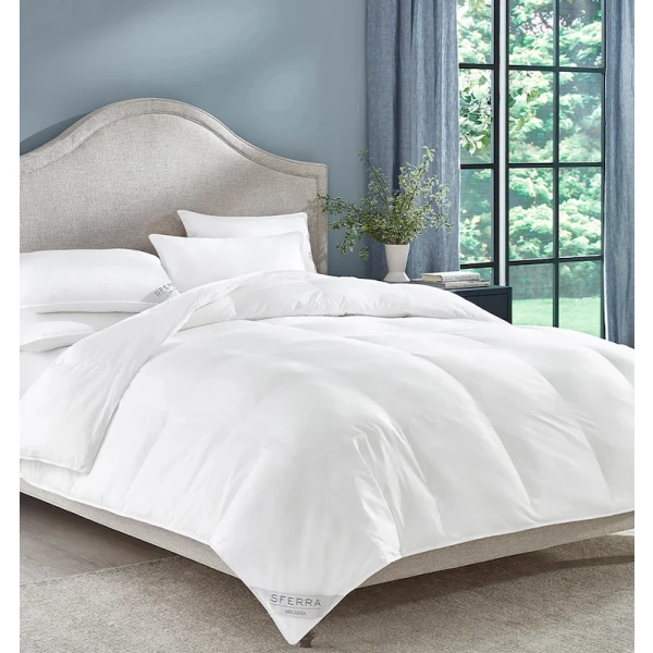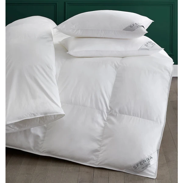 Sferra's Arcadia is their down alternative collection. Lightweight, hypoallergenic microfibers create a down-like loft that’s just as comfortably warm as it is cozy. The heavy and medium duvets have a 15" baffle box construction, piped edging and corner loops. The pillow crosses the thermal-insulating properties of featherweight down with the easy-care attributes and hypoallergenic quality of modern techno-fibers. The result is a down-like comfort with matchless quality.