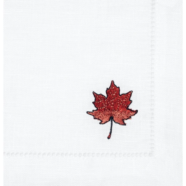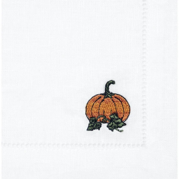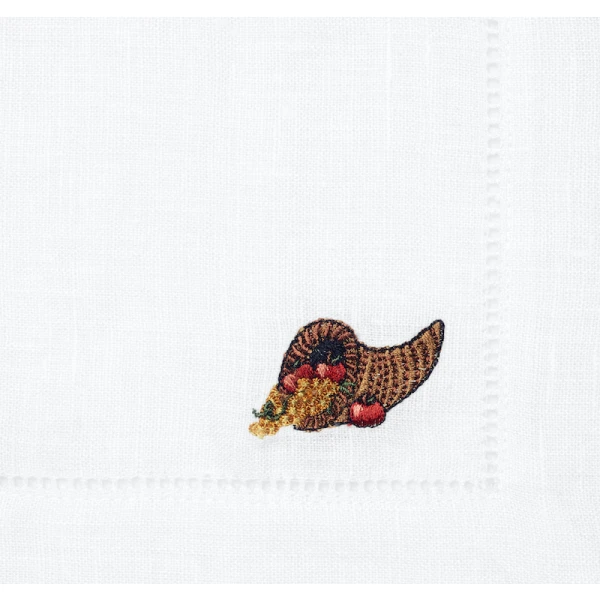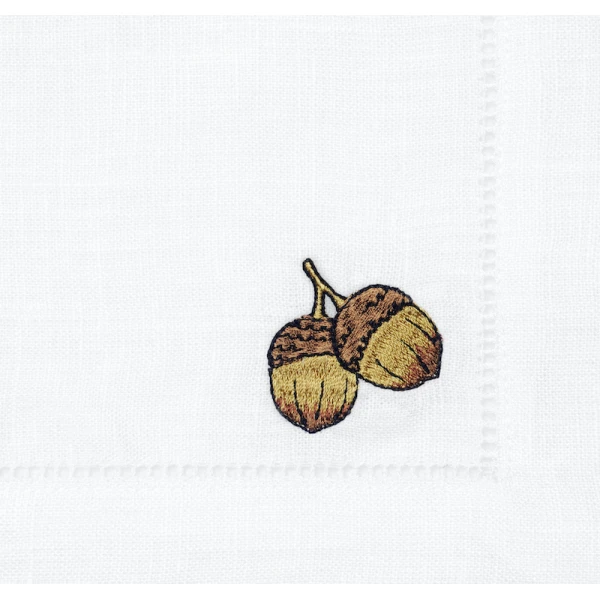 Sferra's Autunno cocktail napkins were created as a whimsical homage to all that makes people love cooler weather and the change of season: pure white, hemstitched linen that says sophistication, with colorful embroidery of the traditional FALL motifs.  Each collection includes a set of acorns, cornucopia, pumpkin and fall leaf. 100% Linen