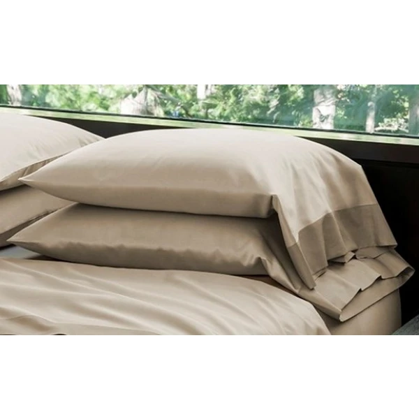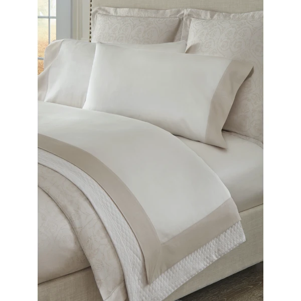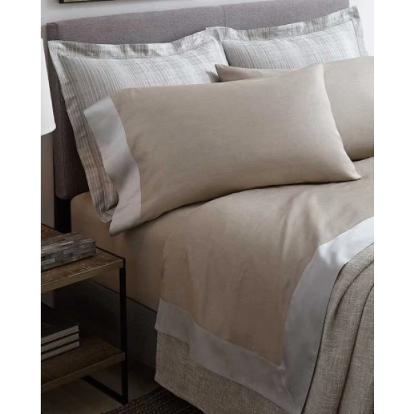 As refined and rich as Larro's warmly hued sateen may look at first glance, that's only half the story. As a double-faced sheeting, even in reverse it has as luscious a hue and sleek a hand as the front face. Its cuffs, too, show a contrast color for contemporary style, luminous facets lending depth and distinction to bed dressing. Made in Italy of a yarn dyed sateen. 100% long-staple Cotton. Finished with a classic style cuffs -- approximate measurements: Flat Sheet and Pillowcase cuffs: 4-inches. Plain Hem.