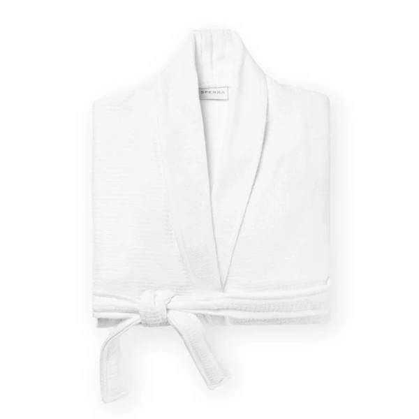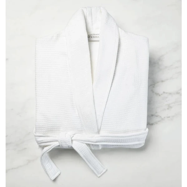 Sferra's Berkley Robe is as pa-inspired unisex robe that is lined in pure white terry cloth for a super-plush and thirsty interior, while the exterior of the robe features a thermal waffle-weave texture, for the ultimate performance in warmth and style. It has a shawl collar, 2 patch pockets, and is self tie with loops. 100% cotton Waffle/Terry combination. Turkey.