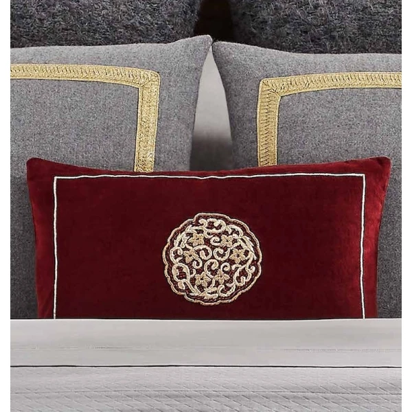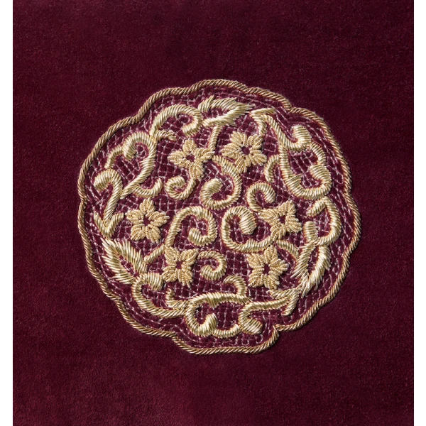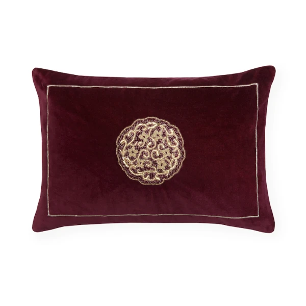 Sferra's Burano decorative pillow was inspired by badges on military uniforms.   Sferra’s iconic lace ball logo in golden Zardozi embroidery is set against the soft surface of red velvet and framed with metallic satin stitch for a look of captivating regality. Burano can be a standalone accent or nicely paired with the limited-edition bedding Cadetto. 100% Cotton Velvet exclusive of decoration; Insert: 95% Feather / 5% down. Knife-edge w/ Hidden Zipper.  Italy.