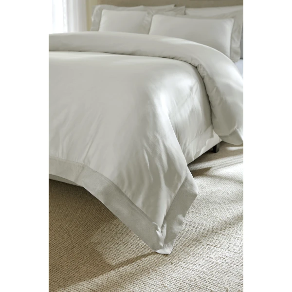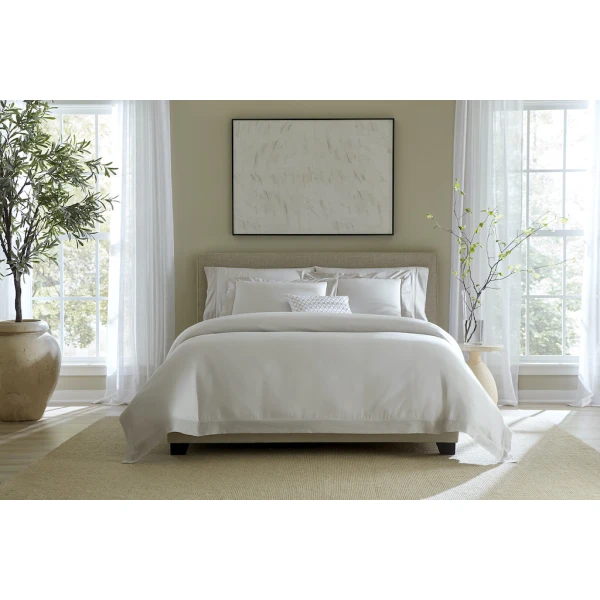 Sferra's Carlotta bed linens are inspired by delicate lace. The cuff's texture offers a beautiful and meticulous experience. The elegant sateen backdrop is luxurious and a whisper against the jacquard cuff. 100% Long-Staple Cotton. Yarn dyed Sateen. Country of Origin: Italy.