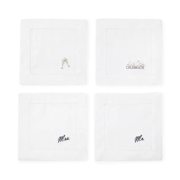 Sferra's Celebrations Cocktail Napkins make the perfect gift or if you'd like to add that special something to mark any special occasion like a wedding, engagement party or even New Year's Eve.  Pure White hemstitched linen with fun and elegant embroidery.  Embroidered on white Festival cocktail napkins.  Corners are mitered. Comes in an organdy bag.