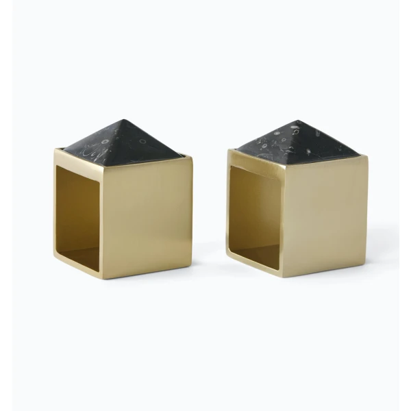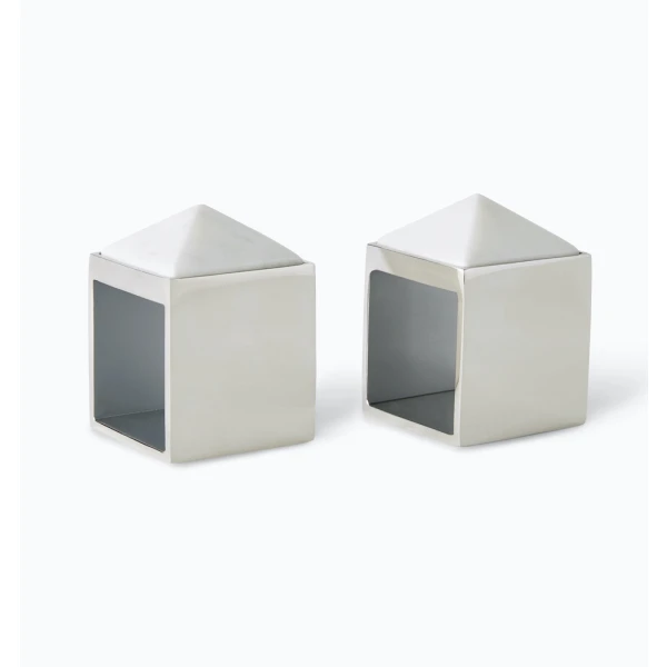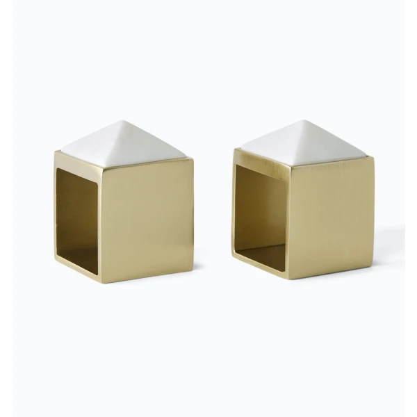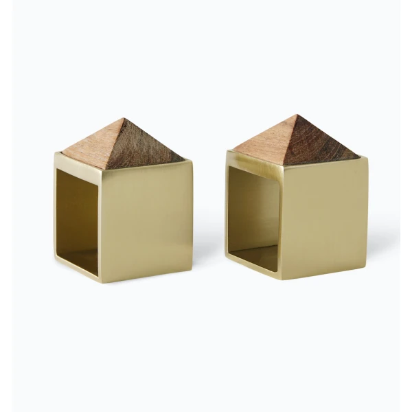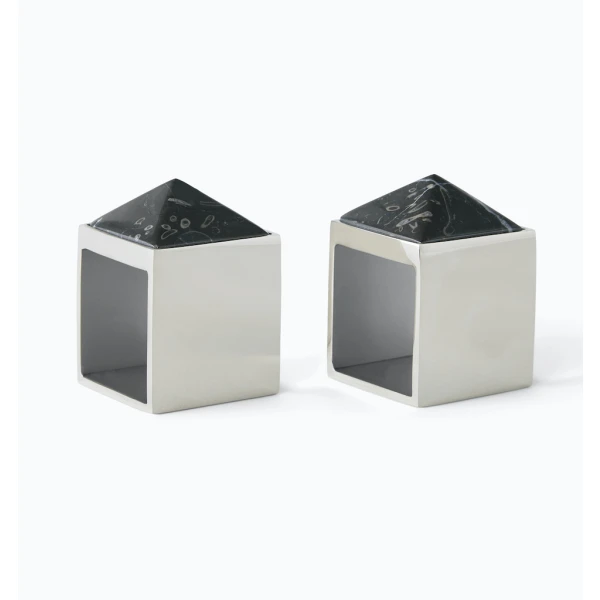 Sferra's Cestia Napkin Rings will add flair and structured contrast to your place settings and table scape.  The angular forms and powerful materials make for a stunning napkin ring.  Set of two.  Stainless steel, Acacia wood, white marble, and black Marquino marble.  India.