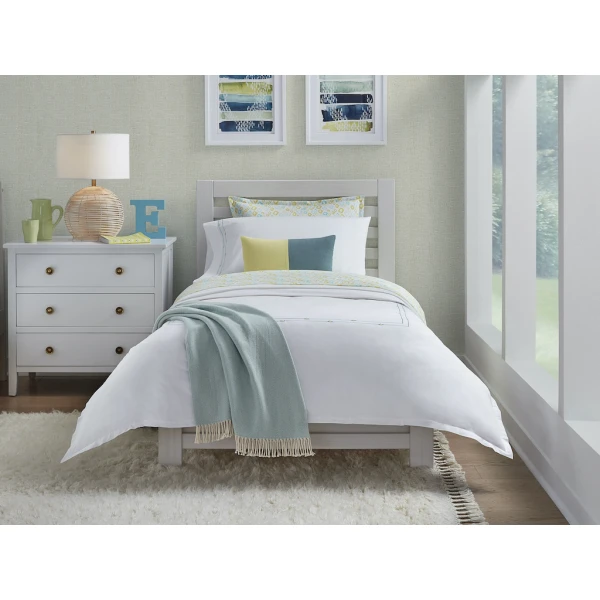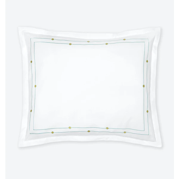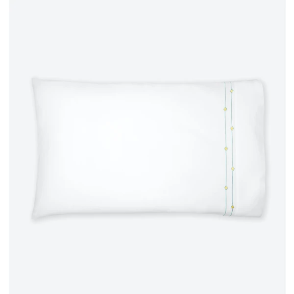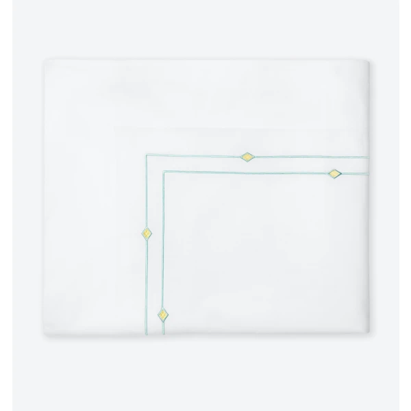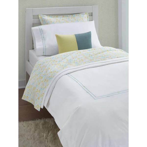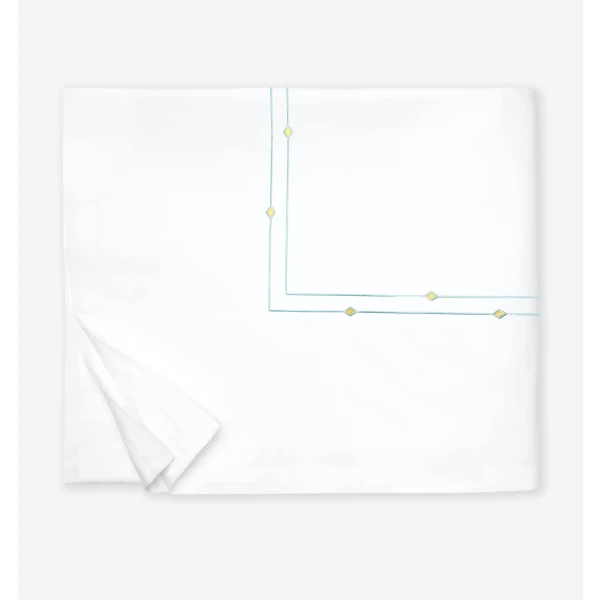 Sferra's Diamantini is an embroidery collection with a sense of playful sophistication.  It has a satin-stitch double border of aqua that is accented by yellow diamonds.  It pairs beautifully with the whimsical Geometric collection for a finished look that brings a youthful spirit to the bedroom.  It has a plain hem finish.  Duvet Cover and shams have 1" mini flanges. Flat sheets and cases have 3" flanges.  Embroidered percale.  100% long-staple cotton.  Italy.