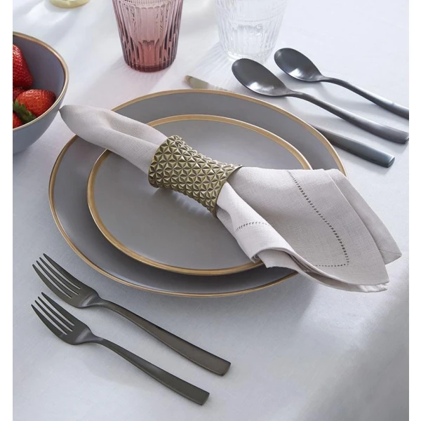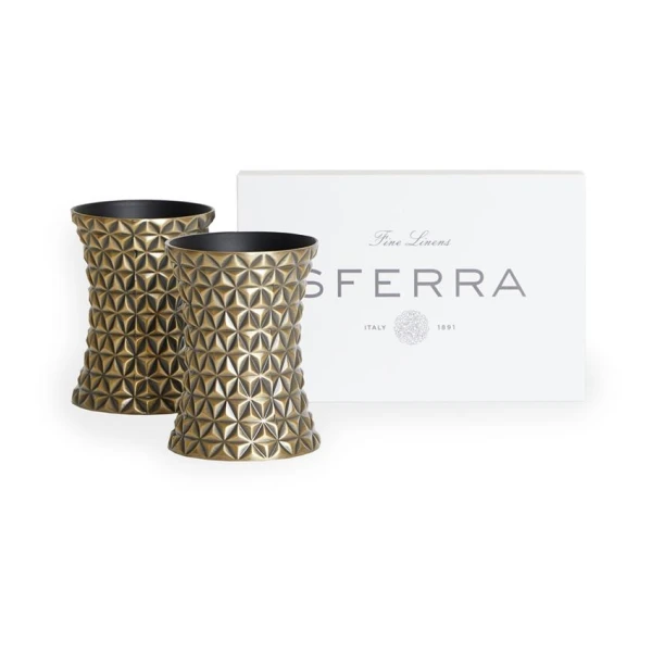 Facet is just that. Full of diamond-like facets that will illuminate any table linens.  They are finished with a satin goldstone which give Facet Napkin rings a rich and stunning depth.  Sold in a set of two in a beautiful Sferra box.