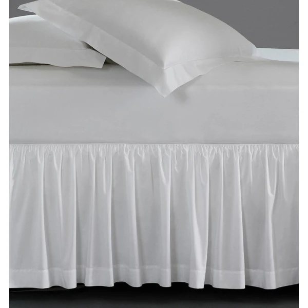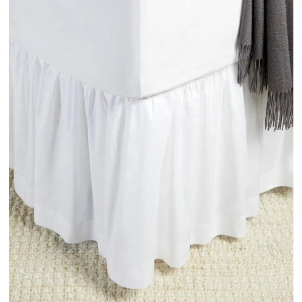 Sferra's Celeste Gathered Bed Skirt is from their best-selling percale bedding. It is woven in Italy from pure, extra-long-staple cotton for a super soft hand. It has simple hemstitching along the sheet. The bed skirt consists of 3 gathered panels and a set of pins to anchor it. This way it is easily adjustable.  Can fit up to 18" drop. Plain hem. 100% cotton percale. Made in Italy.