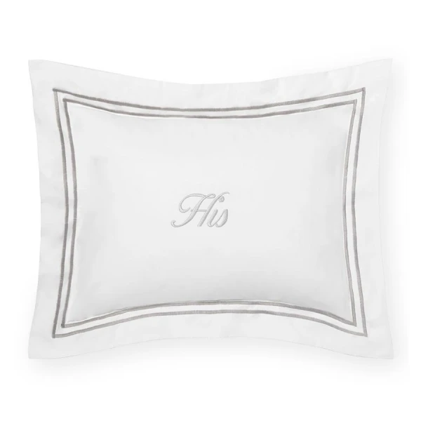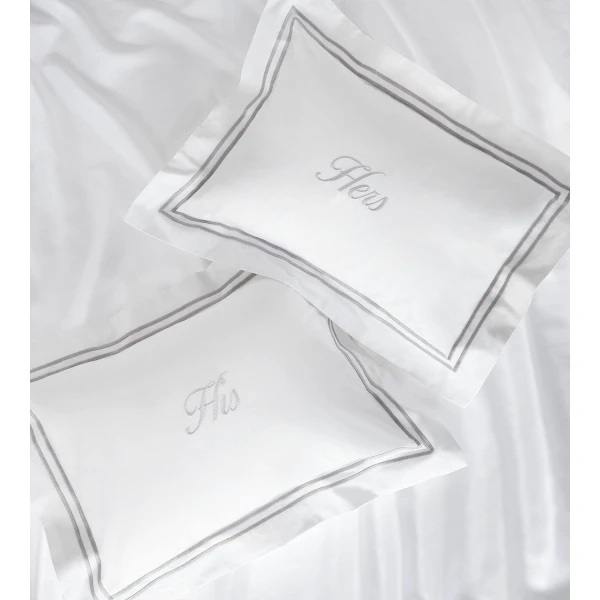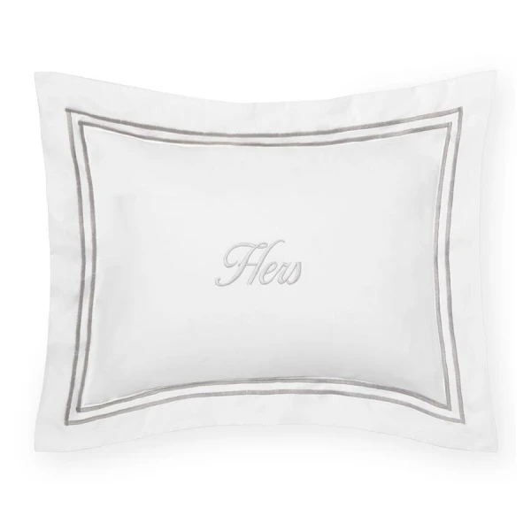 Monogrammed on a Grande Hotel percale boudoir, the His and Hers pillow is whimsical yet sophisticated.  Buy individually, they ship with a 95/5 feather/down insert.  Silver monogram on white.