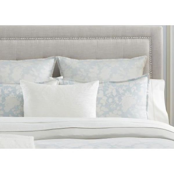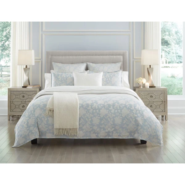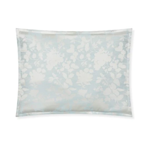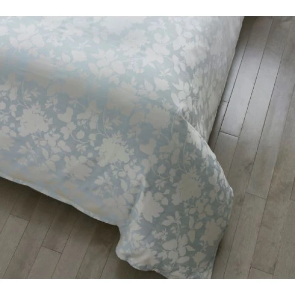 Nalia is an homage to the early Italian artisans and vendors. These craftsmen who demonstrated the delicacy of Sferra lacework using cyanotypes. Cyanotypes are blueprints of intricate designs. Nalia's floral motif, designed as if hand painted imitate those cyanotypes, while creating a silky and cascading ombre effect. Shades of blue cross woven with white in a sumptuous jacquard.