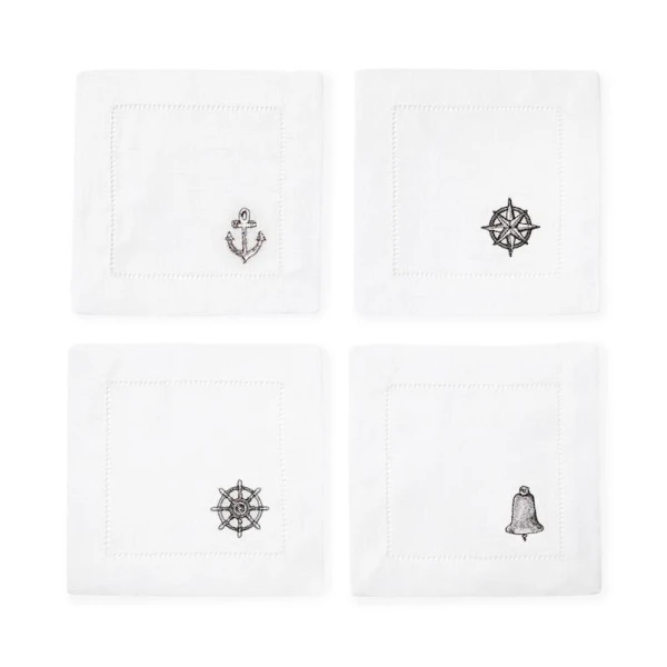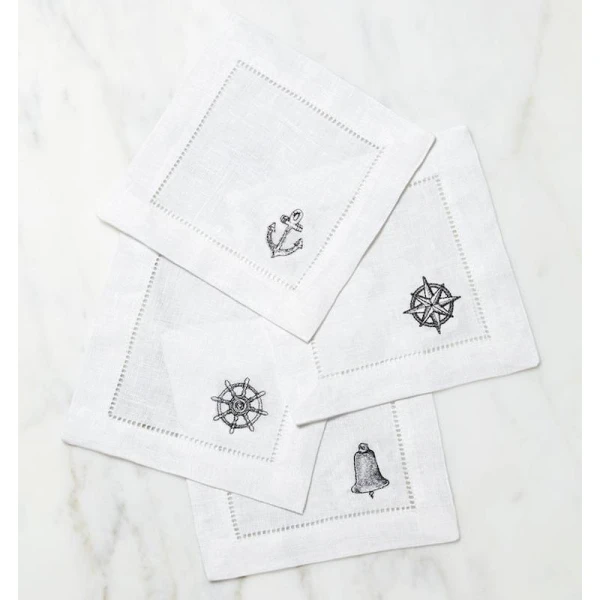 Sferra's Nautico cocktail napkins are so charming and perfect for entertaining by the beach or if you are a fan of anything nautical. You'll get 4 different designs one of each napkin - An anchor, A ship's wheel, a bell and a compass star.   Embroidered on white hand- thread-drawn hemstitch Festival cocktail napkins.  Corners are mitered. Comes in an organdy bag.