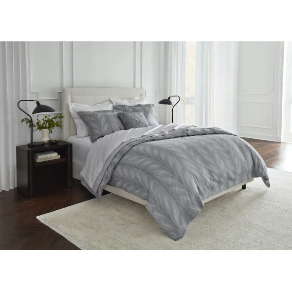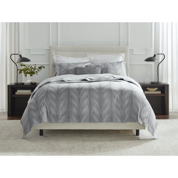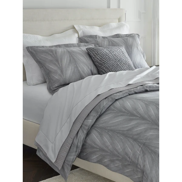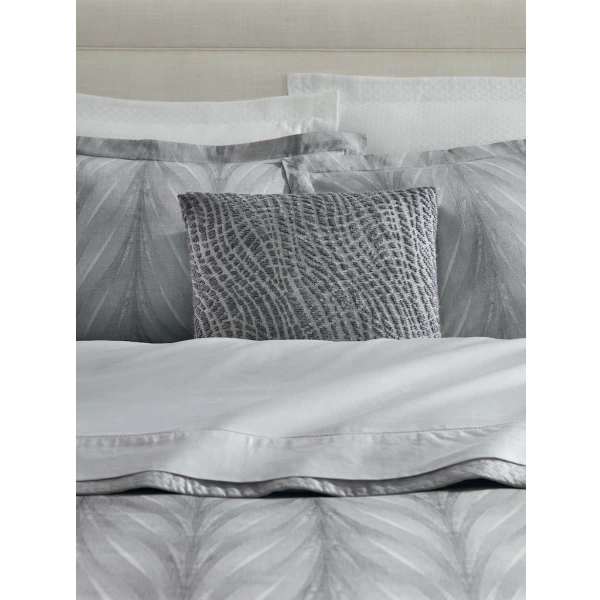 Sferra's Piuma is graceful and delicate just like its abstract feathered pattern. Flint colored yarn dyed sateen jacquard.  It has shortened flanges.  2.5" on the duvet cover, 2" on shams, and 1.5" on the boudoir.  The hem is plain.  100% long staple cotton.  Italy.