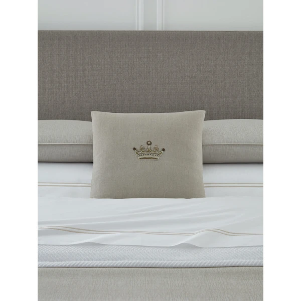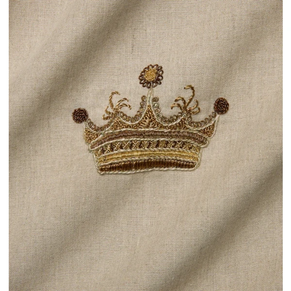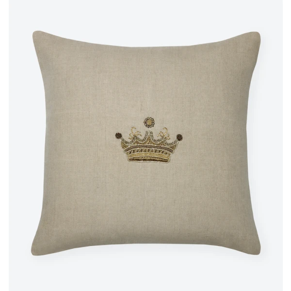Sferra's Regale Decorative Pillow has an artistic and royal feel.  It is meticulously hand-embroidered, shimmering crown motif of Regale highlights the grandeur of home with a hint of lightheartedness.  Knife edge finish.  Zardozi Embroidery.  100% Linen base with 100% Cotton lining, exclusive of decoration.