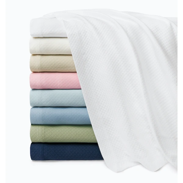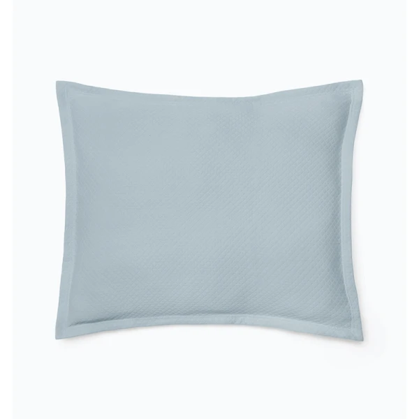 Sferra's Rombo in Poolside is simple yet beautiful. The matelasse and shams are of a minimalist pique. It is finished with a double need stitching for a subtle diamond finish. Blanket cover has 2" shortened flanges, shams have 1" shortened flanges, and boudoir has 1" shortened flanges. Plain hem finish. Piece dyed pique. 100% pre-washed cotton.  Portugal.