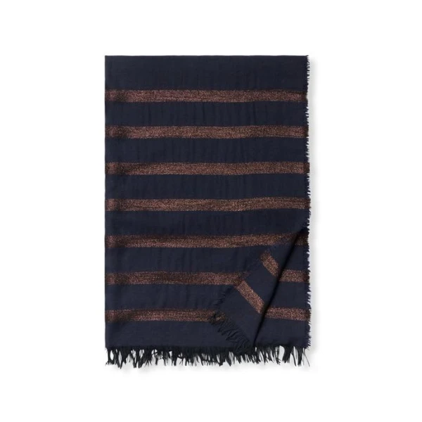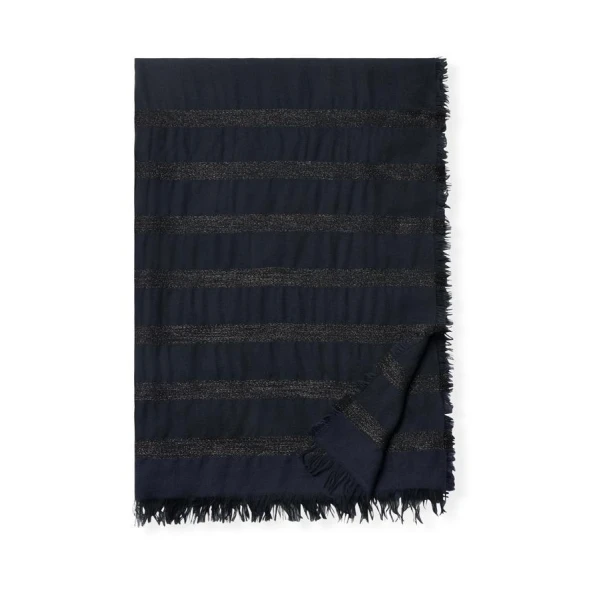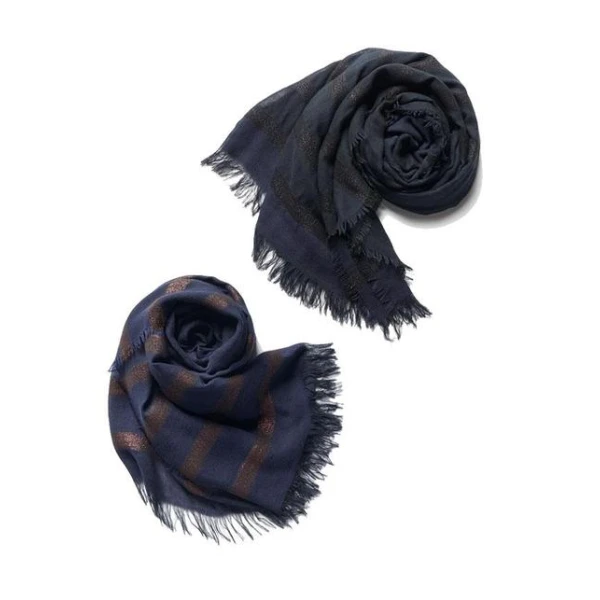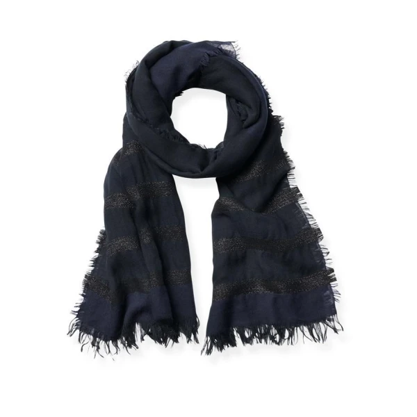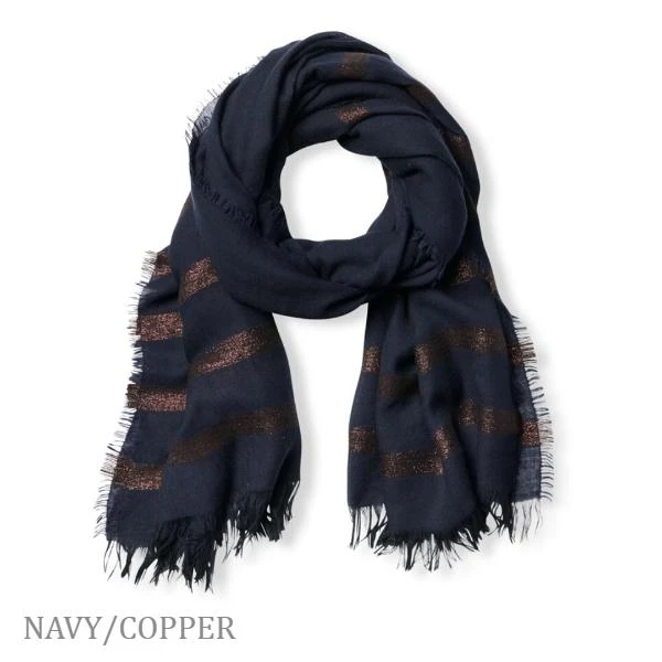 Sossi, from Sferra is a luxurious scarf available in solid black on copper or navy.  Made in Italy, the scarf is a blend of modal(60%), Vrigin Wool (26%) and Viscose (10%).  Fringed, the scarf measures 28 x 86.  Packaged in a organdy gift bag.