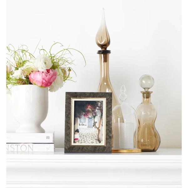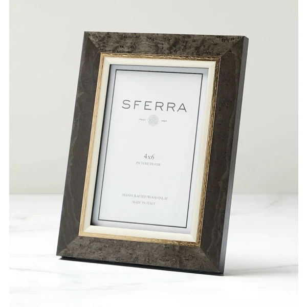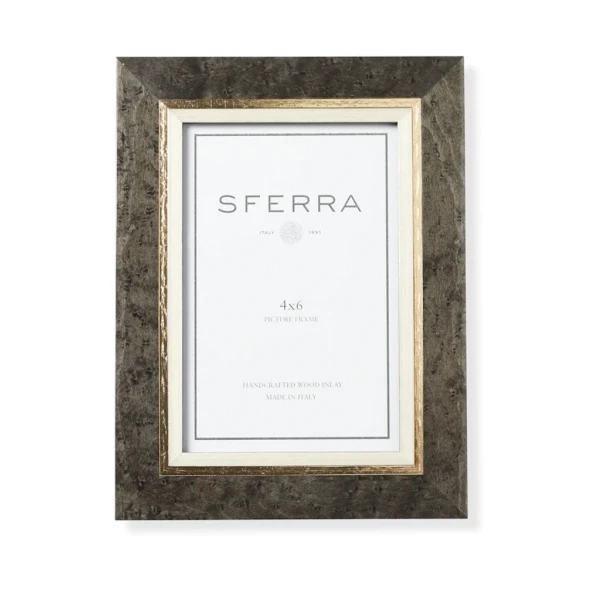 Sferra's Sovana Wooden Picture Frame features a grey, marbled finish, offset by a gold- and ivory-colored inlay trim. It is handcrafted in Italy from natural woods. 94% Tulip wood / 4% Erable / 1.8% Poplar / 0.2% hot stamping foil gold color.  Made in Italy.