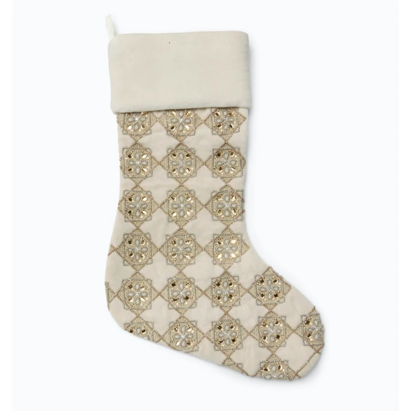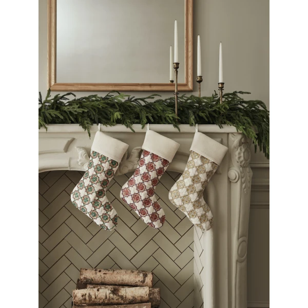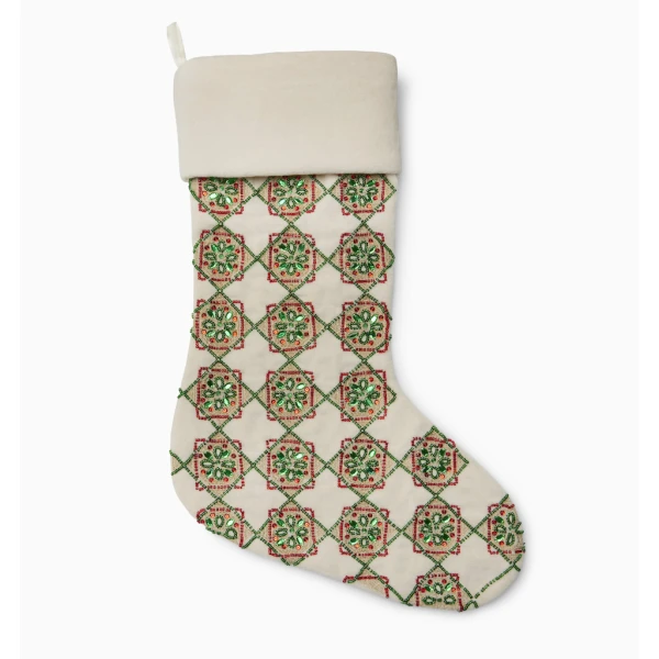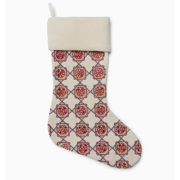 Sferra's Speranza Stockings are festive and sophisticated. It has stunning embroidery that was inspired from vintage Italian tiles. The classic holiday colors shines through on their velvet base.