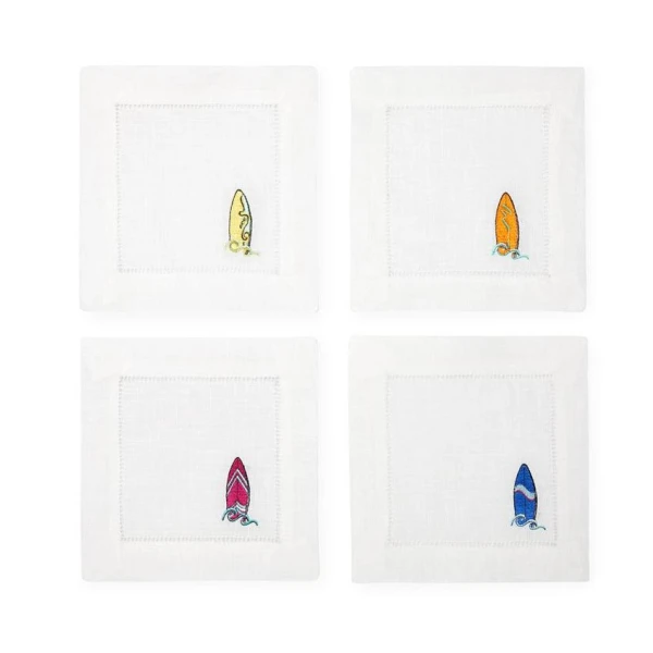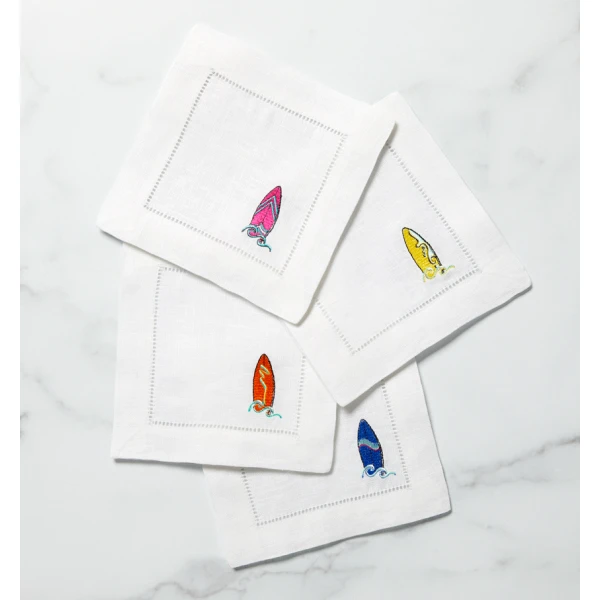 sophistication, with colorful embroidery of Surf Boards with a small wave. Each collection includes 4 different colored surf boards . A set of 4 makes the perfect hostess gift. 100% Linen. Embroidered on Festival cocktail napkins. Comes in organdy bag.