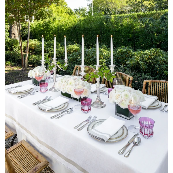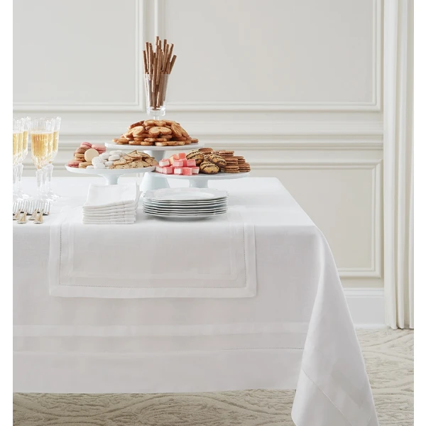 Appealing to both hand and eye, Tipton is an elegant classic. Beautiful hemstitching is on each side of the small sateen border -- which is on both the napkins and the tablecloth. One of our best selling tablecloths.