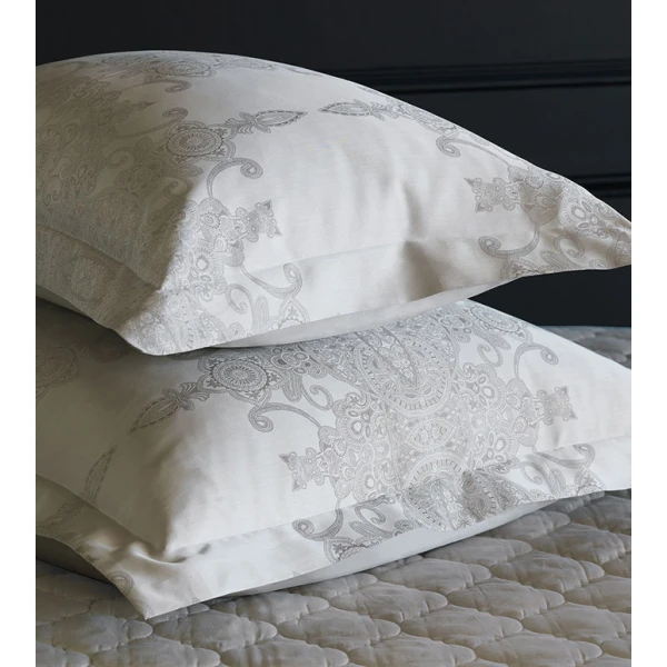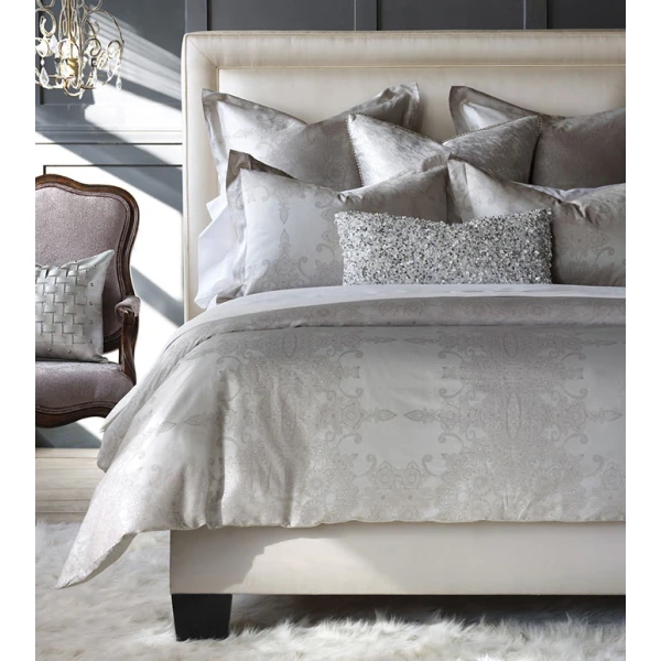 and reverses to Deluca Silver. It has a knife edge finish, ties inside duvet cover and a hidden button closure. Shams have a 2" self flange edge finish and a flap closure. 100% cotton jacquard fabric. Reverses to 300 thread count, 100% Egyptian Cotton Sateen in Deluca Silver.
