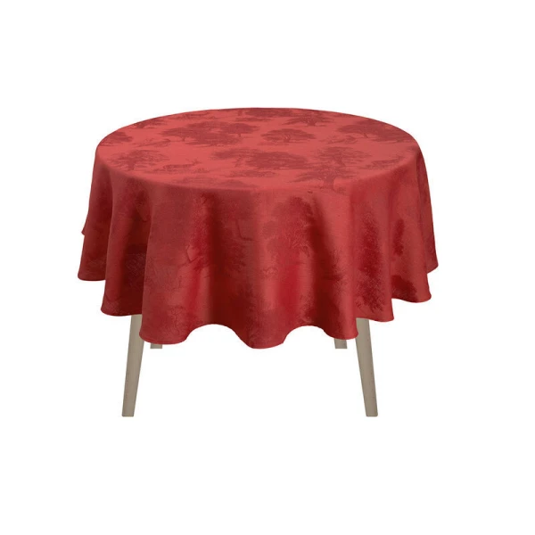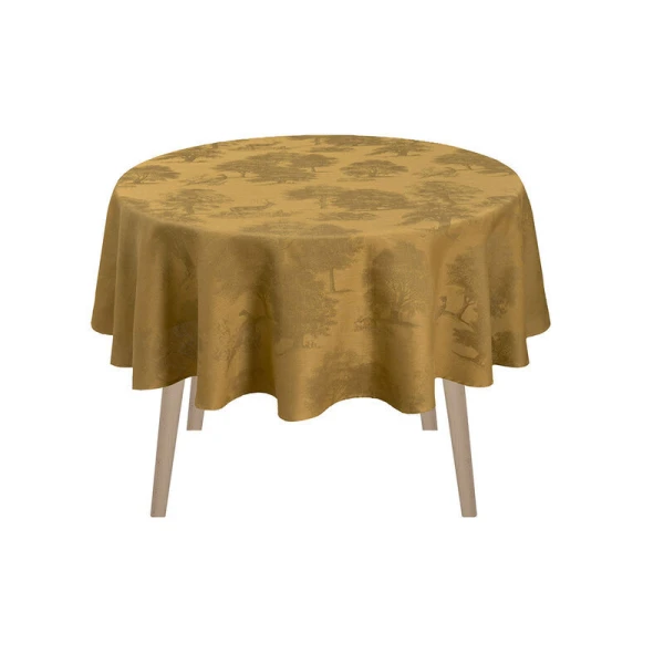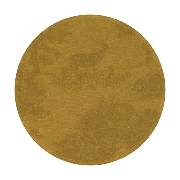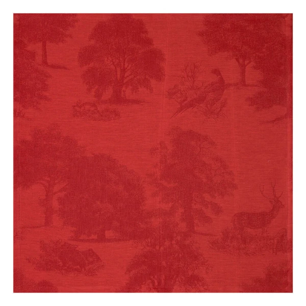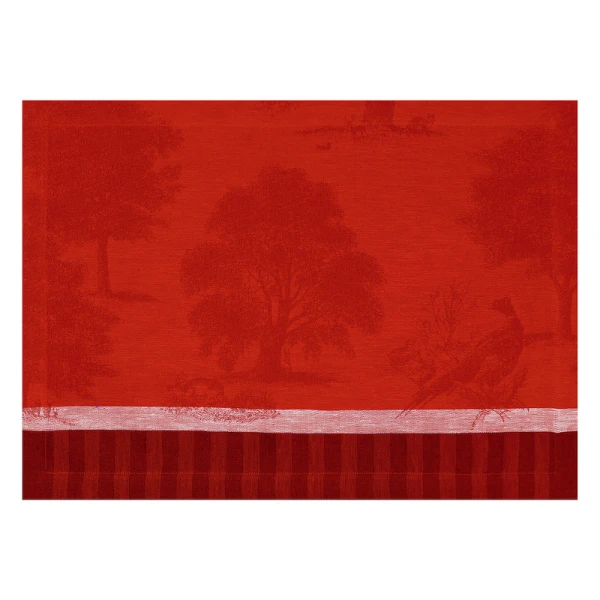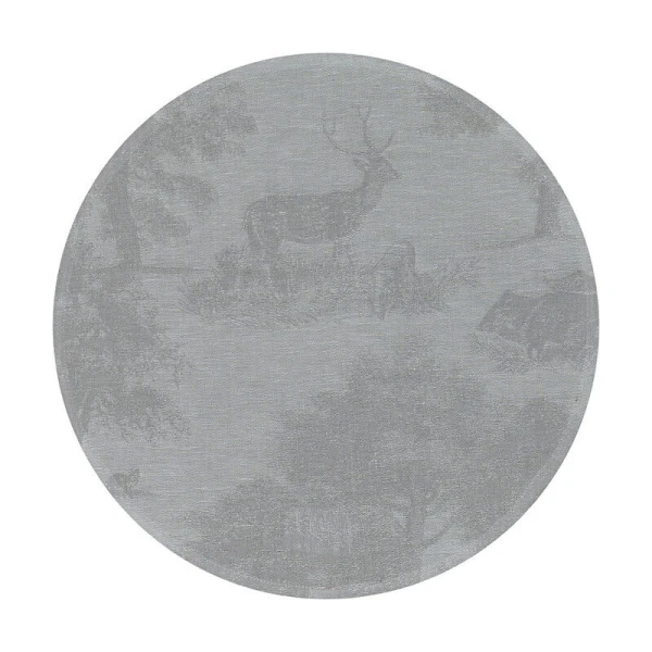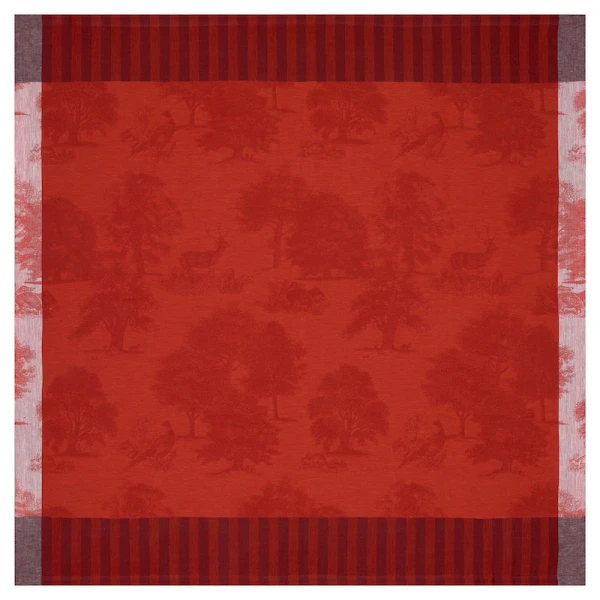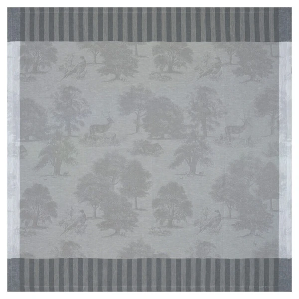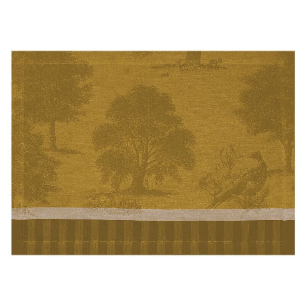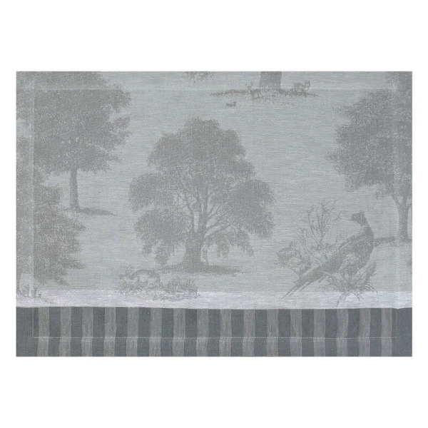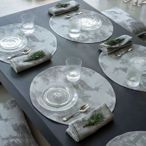 Le Jacquard Francais' Souveraine table linens were inspired by the beauty and tranquility of nature.  This collection transports you into the heart of a magical, enchanting forest. A grandiose collection for a true ode to nature.  It is designed like a toile de Jouy, with pheasants, wild boar, fawns and hares basking in the midst of lush vegetation.
