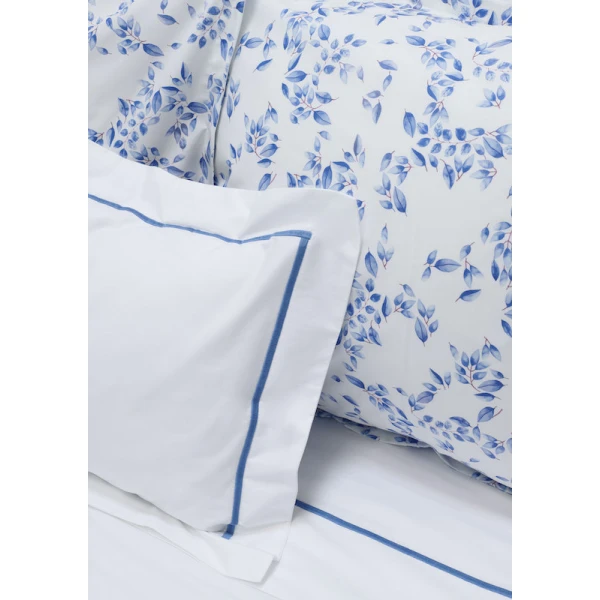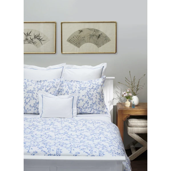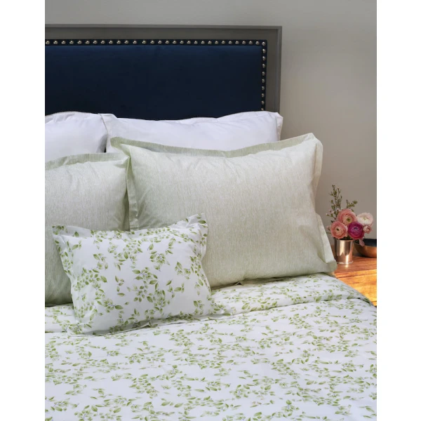 Stamattina's Chloe is sweet and vibrant. Small scattered leaves design is organic looking and fresh. Fresh white background with choice of blue leaves or green leaves.  Shams have 1” flange. The duvet covers are self reversing. Finished with a plain hem. Chloe plays well with several other Stamattina collections.  We especially love it with Marco and/or Michael.  Printed and finished in Spain and constructed in USA.
