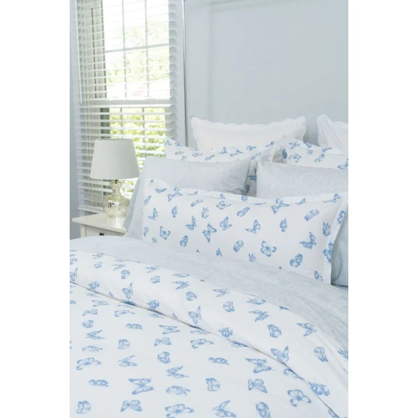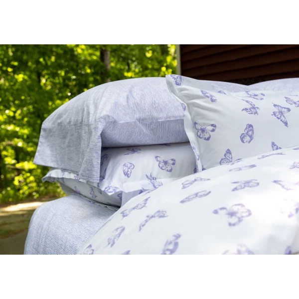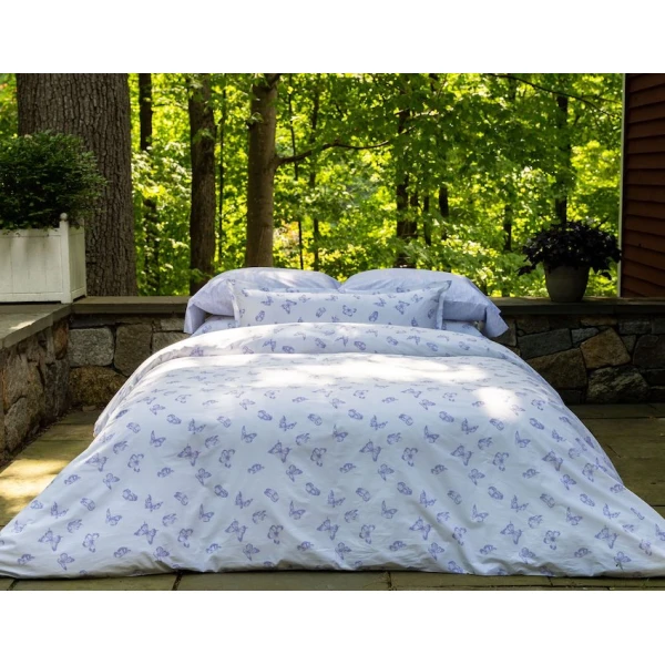 Stamattina's Farfale has a design of Blue or Lavender butterflies scattered on a white background.  Shams have a 1” flange.  The duvet covers are self reversing.  Plain hem.  Printed and finished in Spain.  Constructed in USA.