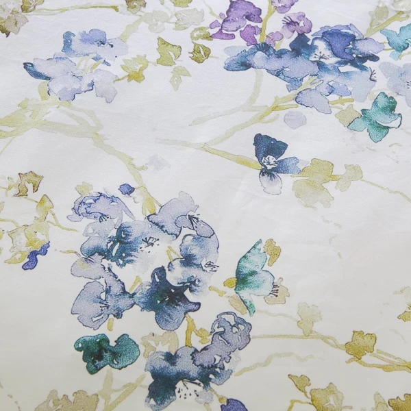 Stamattina's Olivia is a darling floral watercolor print of blue and lavender flowers with green vines. Printed and finished in Italy Constructed in USA. Colors of print on white background. Printed and finished in Italy. Constructed in the USA.