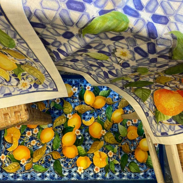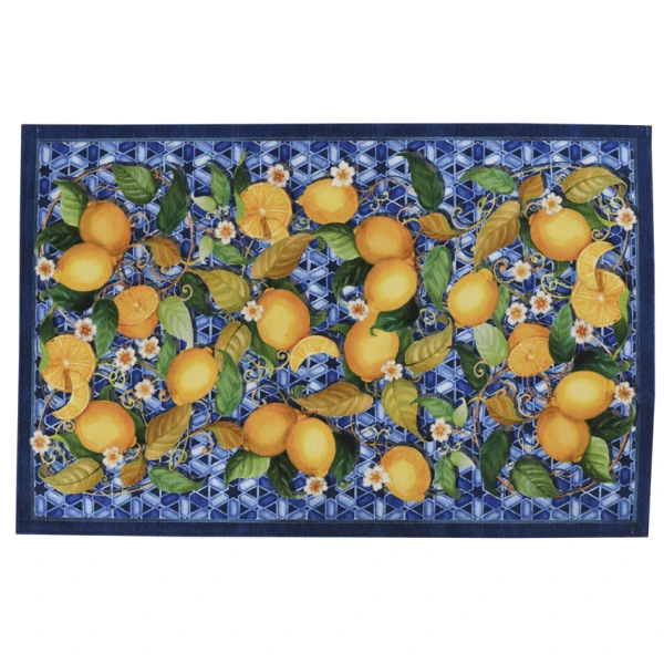 Sevillana's design is pure sunshine. Plump lemons and vines are all lounging on beautiful bright blue tile patchwork. This rug is perfect for those warm and sunny summer days. Tip Tapp Rugs by Tessitura Toscana Telerie are great indoor/outdoor rugs. You can spruce up any space with these rugs. Whether it is your kitchen, entryway, bathroom or porch they will bring some color and flair. Due to its small grips on the bottom side your rug will be stable and be non-slip. Machine washable. Rugs come in a recycled polyester case. 80% recycled polyester 20% polyester.