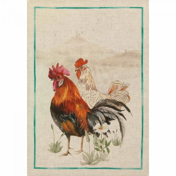 Gauloise depicts two birds -- a rooster and a hen out in nature.  Printed on a natural colored linen background and bordered in shades of Aqua. Also available in a companion towel called Gauloise Bianco.
