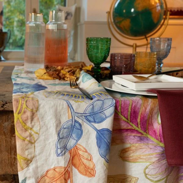 Tessitura Toscana Telerie is a wonderful linen company that designs and manufactures all their products in Tuscany, Italy. We are proud to import their products for the US market. Foliage has leaves in deep jewel tones on a cream background. Works with formal china or can be scaled down to a casual look. Runners are engineered. Tablecloth have self hem finish and mitered corners. Printed on 100% Hemp and available in a large selection of sizes. Items packed in bags made of the same fabric as the product. We are proud to import their products for the US market.