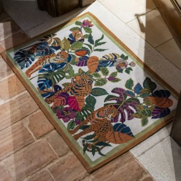 Tip Tapp Rugs by Tessitura Toscana Telerie are great indoor/outdoor rugs. You can spruce up any space with these rugs. Whether it is your kitchen, entryway, bathroom or porch they will bring some color and flair. Leaoleaf's design showcases the intriguing leopard in its exotic floral surroundings. Due to its small grips on the bottom side your rug will be stable and be non-slip. Machine washable. Rugs come in a recycled polyester case. 80% recycled polyester 20% polyester.