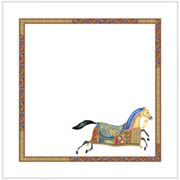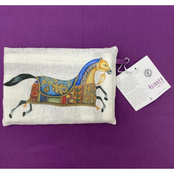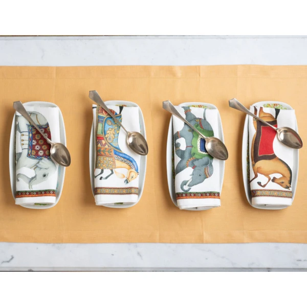 Tessitura Toscana Telerie Maharajah Dinner Napkins are bright and captivating. Each four-piece set features 4 different subjects designed with the usual refinement, taste and artistic flair of Tessitura Toscana Telerie. In this set you will find a variety of animals to be thought to be royalty. In Sanskrit it stands for a "great ruler", "great king" or "high king". These napkins are for those who love beauty in everyday life. Simple hem with mitered corners. 100% linen. Made in Italy.