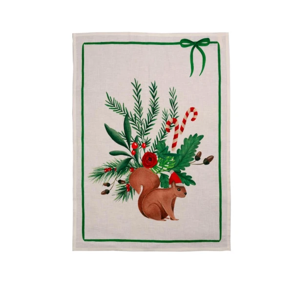 Tessitura Toscana Telerie is a wonderful linen company that makes all their products in Tuscany, Italy. Their kitchen towels are so pretty they could be wall art but strong enough for regular use. Nutnook Green is no exception. The design is of a darling squirrel wearing a Santa hat. He is then embellished with Christmas greenery and candy canes. The border on this towel is finished with a green bow. Use in your kitchen or place in your powder room as they are perfect as a hand towel. 100% linen, they're perfect for lint-free drying. Made in Italy.