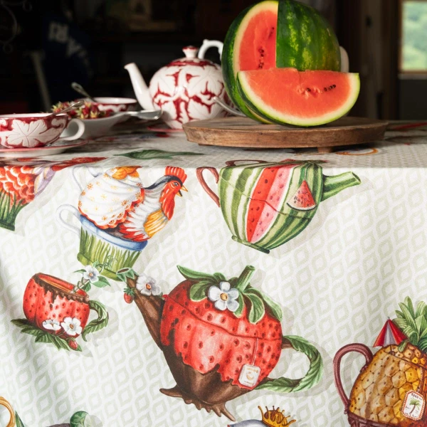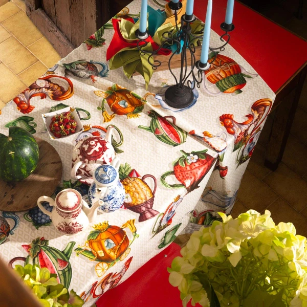 Tessitura Toscana Telerie is a wonderful linen company that produces their designs in Tuscany, Italy. Teabreak is whimsical to say the least. The design is of magical and quirky tea pots and tea cups. Works with formal china or can be scaled down to a casual look.