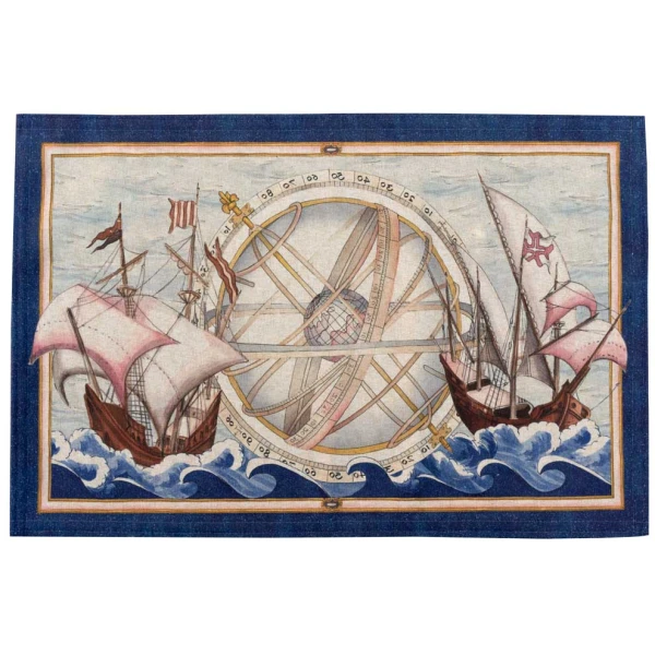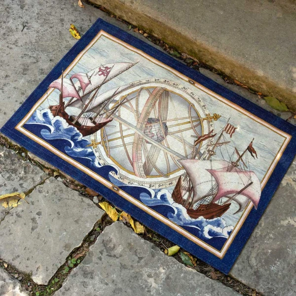 Bounty's design is nautical.  The scene is of two vessels navigating the high seas while turbulent waves comes crashing in on their journey.  The colors are muted but accented by deep rich blue sea. Tip Tapp Rugs by Tessitura Toscana Telerie are great indoor/outdoor rugs.  You can spruce up any space with these rugs.  Whether it is your kitchen, entryway, bathroom or porch they will bring some color and flair.  Due to its small grips on the bottom side your rug will be stable and be non-slip.  Machine washable.  Rugs come in a  recycled polyester case.  80% recycled polyester 20% polyester.