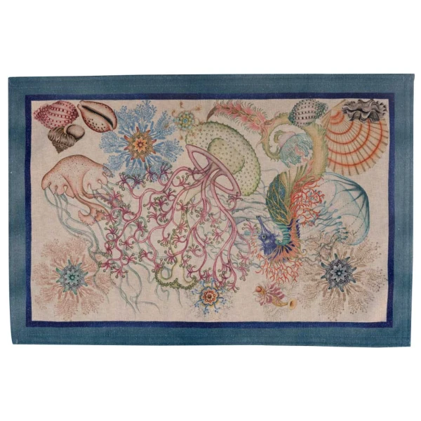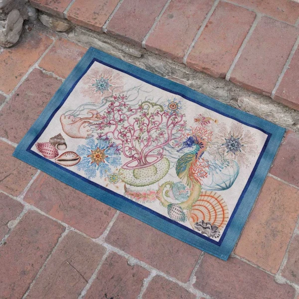 Jelly's design is spectacular.   The scene is miraculous.  From jellyfish to seahorses this rug has all the creatures and colors we all marvel.   Tip Tapp Rugs by Tessitura Toscana Telerie are great indoor/outdoor rugs.  You can spruce up any space with these rugs.  Whether it is your kitchen, entryway, bathroom or porch they will bring some color and flair.  Due to its small grips on the bottom side your rug will be stable and be non-slip.  Machine washable.  Rugs come in a  recycled polyester case.  80% recycled polyester 20% polyester.