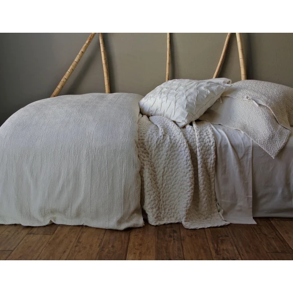 A top seller Jazz has an exquisite blend of silk and cotton, woven in Italy in a lightweight boutis jacquard. The luxury of silk combined with the livability of cotton in our all-natural SDH bedding line that is brushed with color. The Purists is a cotton/silk blend and is in a shade of natural ecru. while the Platinum is 45% Linen, 30% Egyptian cotton and 25% silk -- giving it a a light silver coloration.