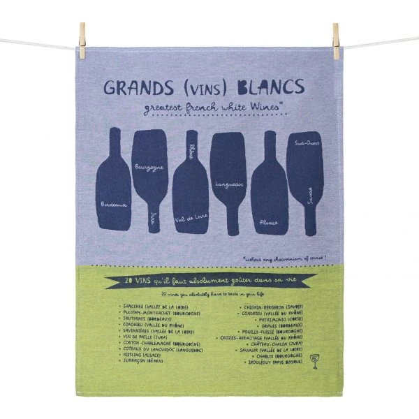 Tissage Moutet's Grands Blancs tea towel is a design from Patrick Lebas. The theme is all about the greatest French white wines. The colors are blues and green. Designed, woven and sewn in our workshop in Orthez, in the south-west of France. 100% Cotton. Size: 20″ x 28″ inches.