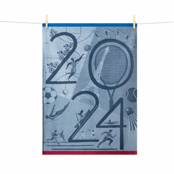 Tissage Moutet's Sports is the tea towel paying homage to the Summer 2024 Olympic Games that are being held in Paris. The colors are in the traditional French Blue and Red. Designed, woven and sewn in their workshop in Orthez, in the south-west of France. 100% Cotton. Size: 20″ x 28″ inches.