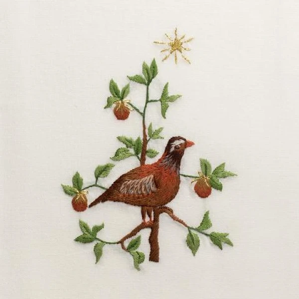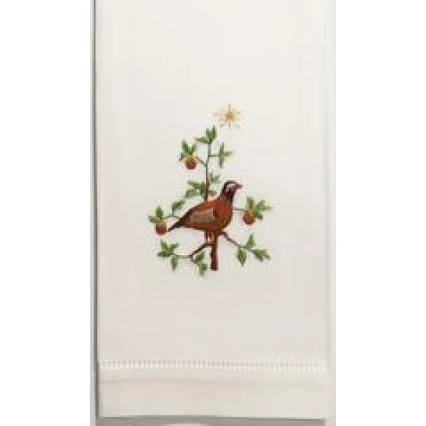 A holiday classic -- a Partridge in a Pear Tree is hand embroidered towel on 100% cotton, finished and hemstitched by hand. Made in Vietnam and imported.