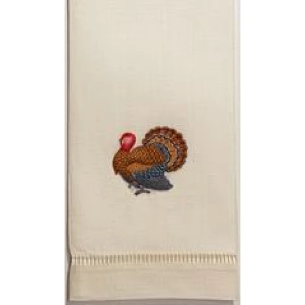 A classic Thanksgiving turkey is hand embroidered towel on 100% linen, finished with a hand-drawn grande hemstitch. Made in Vietnam and imported.
