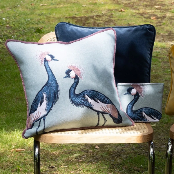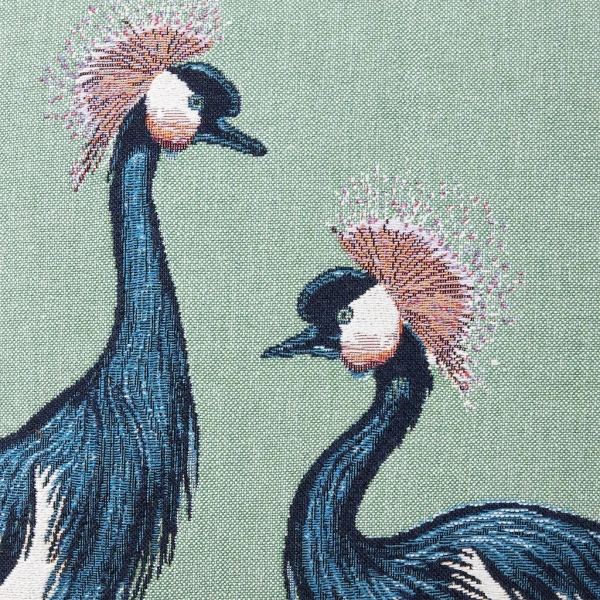 Yves Delorme's Altesses Decorative Pillows in Celadon reveal a couple of majestic crowned cranes, wearing feathered tiaras, on a soft background. An elegant fringed finish echoes their ornate headdress, adding a sophisticated touch to your interior. Made in Belgium.